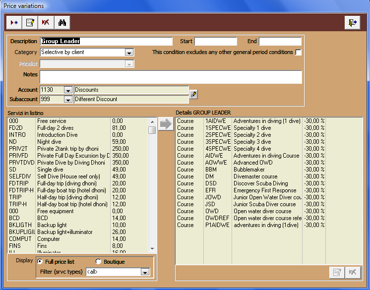 You can define "default" conditions for discount/premiums, specifying the percentage and/or the price to be applied for each list item. For example, if you defined the discount condition "diving card", it is enough to specify this condition at the check-in (or during the billing) and Nautilus will automatically calculate the discount according to the rules you set.